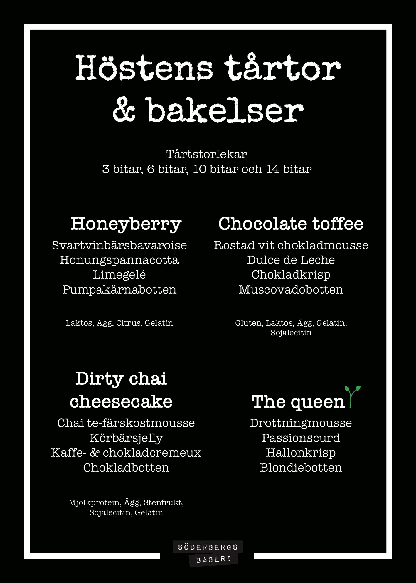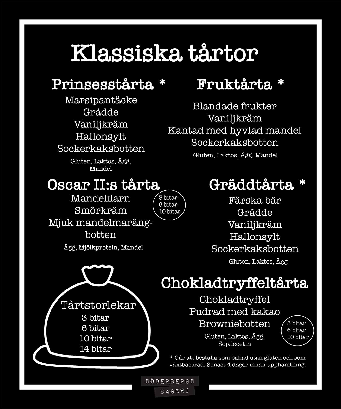 Vi gör både klassiska tårtor moussetårtor, cheesecake och veganska tårtor. Nedan kan du se aktuella smaker och storlekar.